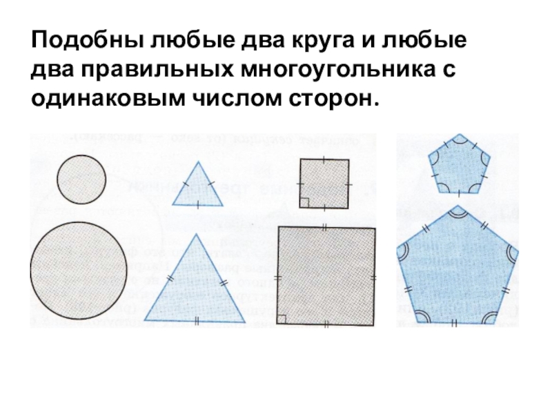 Слайд 8Подобны любые два круга и любые два правильных многоугольника с одинаковым