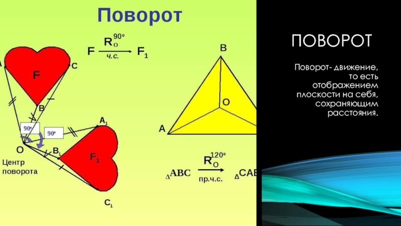 Поворот- движение, то есть отображением плоскости на себя,сохраняющим расстояния.