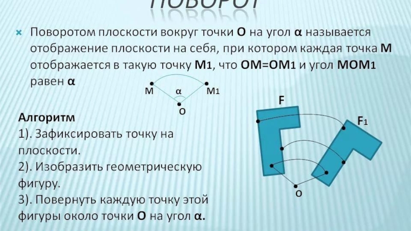 ПоворотПоворот- движение, то есть отображением плоскости на себя,сохраняющим расстояния.