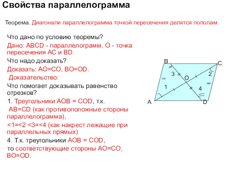 Теорема. Диагонали параллелограмма точкой пересечения делятся пополам.