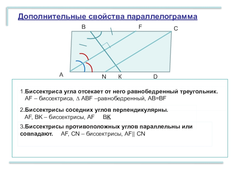 3.Биссектрисы противоположных углов параллельны или совпадают. AF, CN – биссектрисы, AF|| CN
