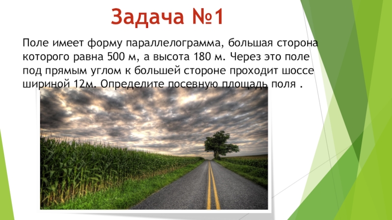 Задача №1Поле имеет форму параллелограмма, большая сторона которого равна 500 м, а высота 180 м. Через это