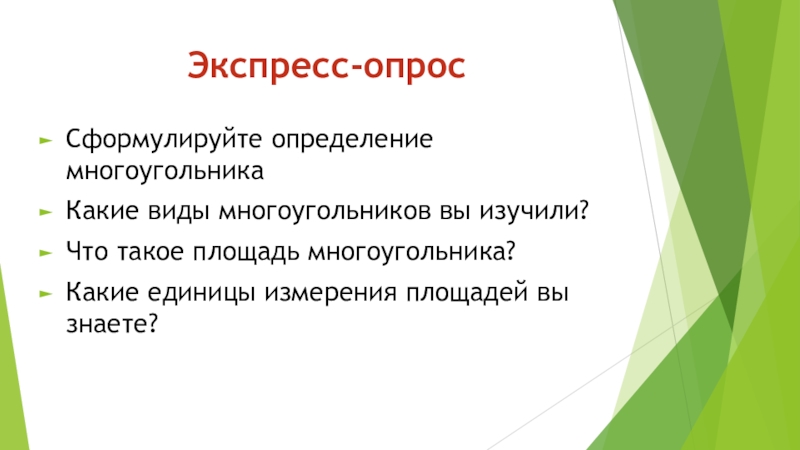 Экспресс-опросСформулируйте определение многоугольникаКакие виды многоугольников вы изучили?Что такое площадь многоугольника?Какие единицы измерения площадей вы знаете?