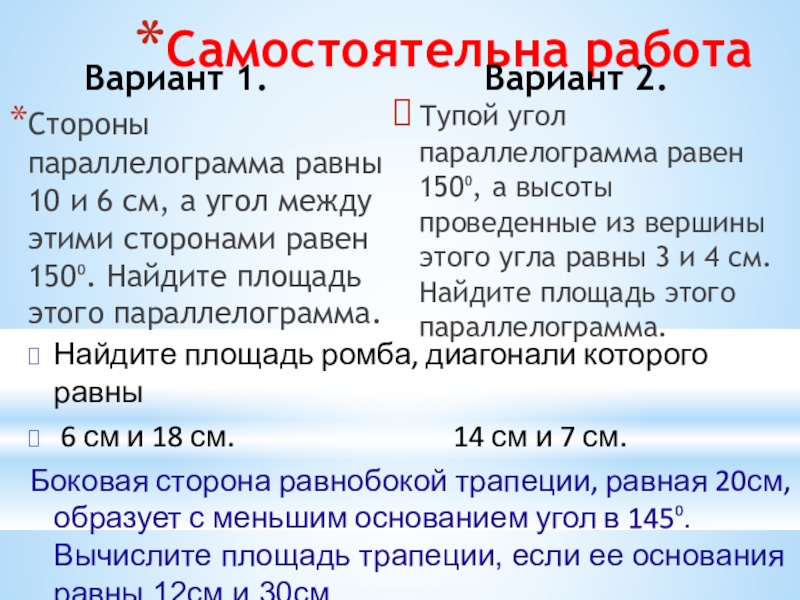 Тупой угол параллелограмма равен 150⁰, а высоты проведенные из вершины этого угла равны 3 и 4 см. Найдите площадь этого параллелограмма.