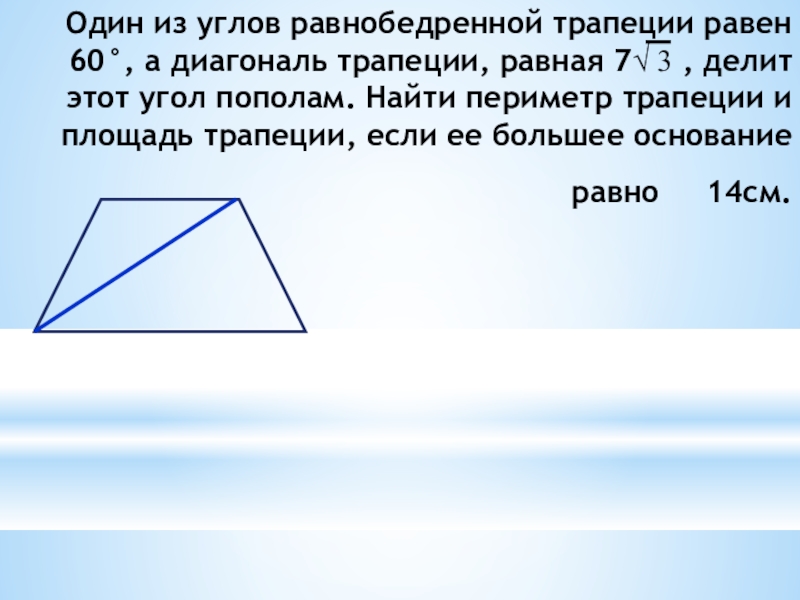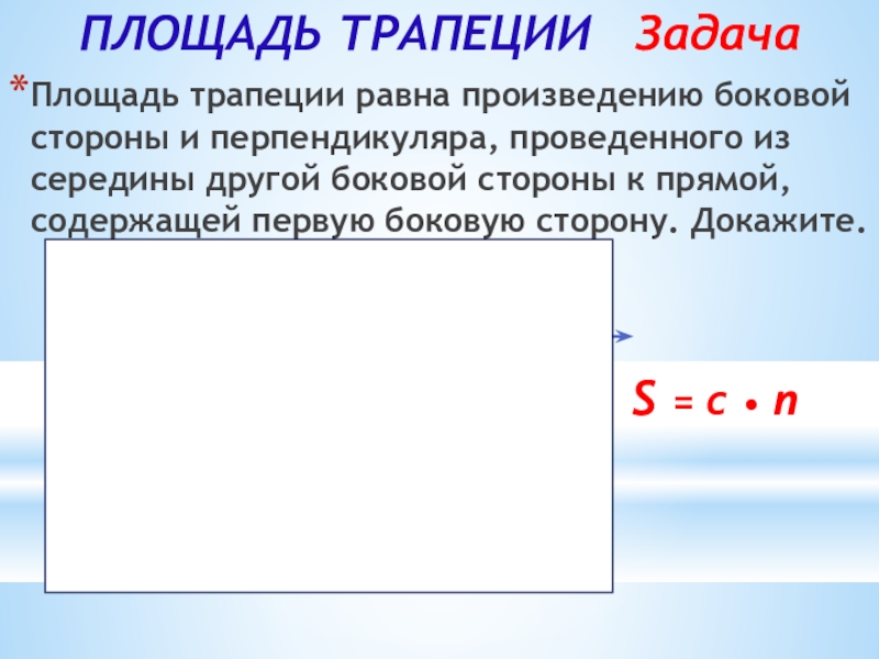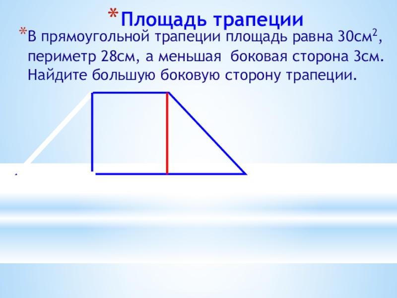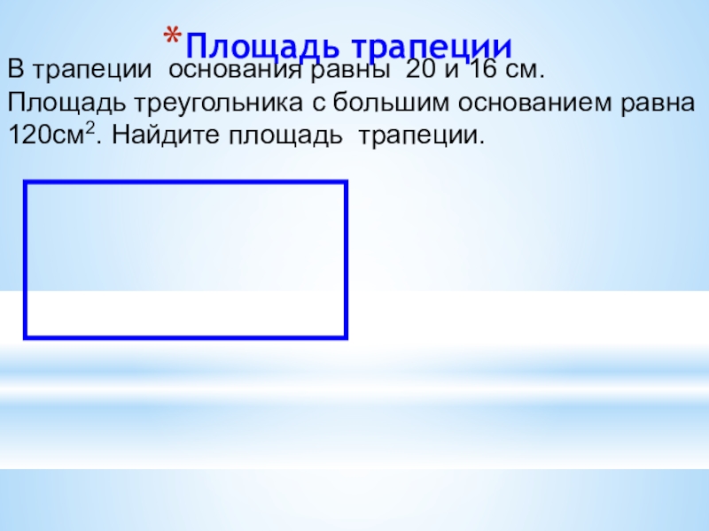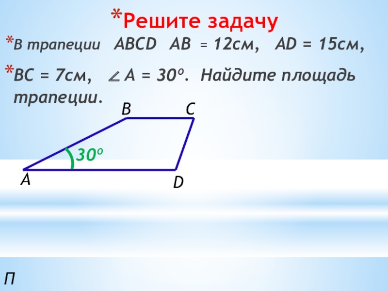 Боковая сторона равнобокой трапеции, равная 20см, образует с меньшим основанием угол в 145⁰. Вычислите площадь трапеции, если ее основания равны 12см и 30см.