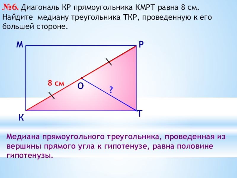 Медиана прямоугольного треугольника, проведенная из вершины прямого угла к гипотенузе, равна половине гипотенузы.