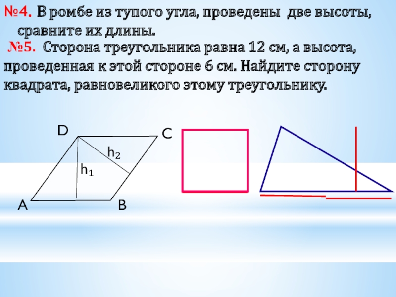 №5. Сторона треугольника равна 12 см, а высота, проведенная к этой стороне 6 см. Найдите сторону квадрата, равновеликого этому треугольнику.