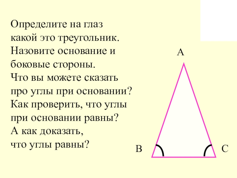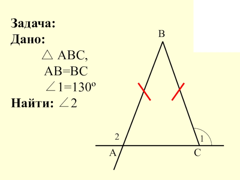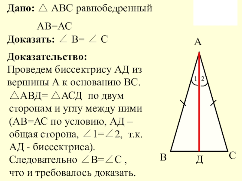 АВД= АСД по двум сторонам и углу между ними (АВ=АС по условию, АД – общая сторона, 1=2, т.к. АД - биссектриса). Следовательно В=С , что и требовалось доказать.