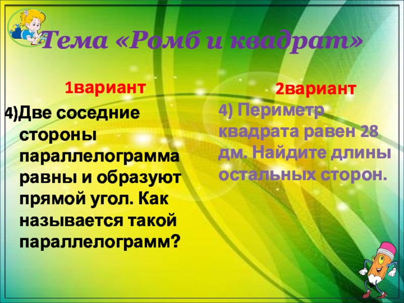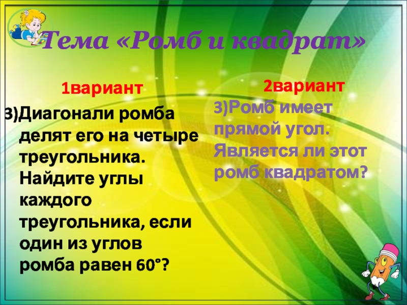 3)Ромб имеет прямой угол. Является ли этот ромб квадратом?