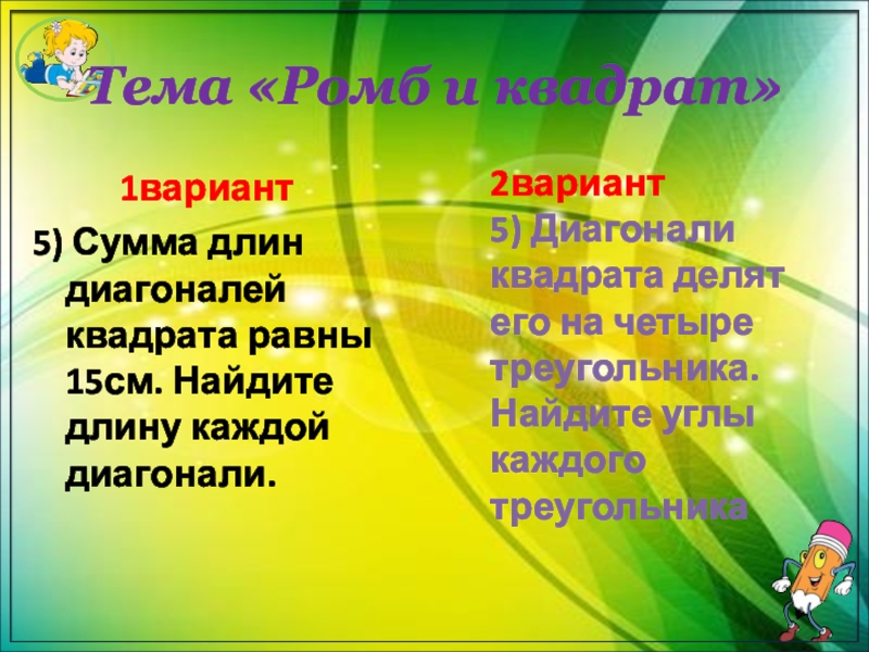 5) Диагонали квадрата делят его на четыре треугольника. Найдите углы каждого треугольника