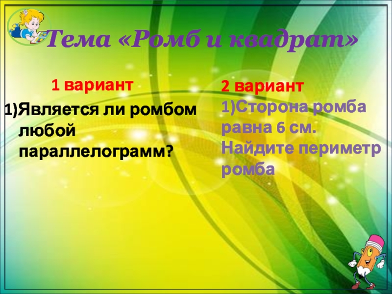 1)Сторона ромба равна 6 см. Найдите периметр ромба