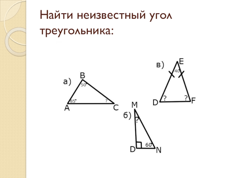 Слайд 7Найти неизвестный угол треугольника: