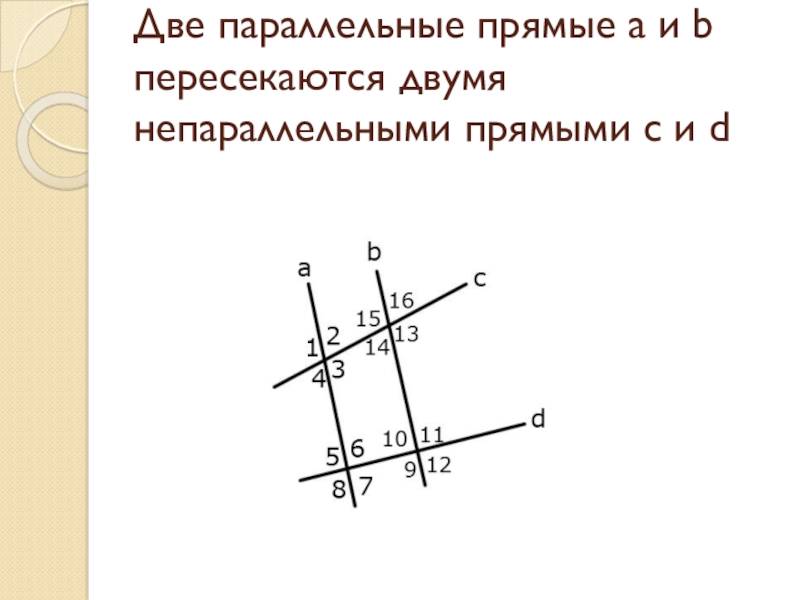 Слайд 5Две параллельные прямые a и b пересекаются двумя непараллельными прямыми c