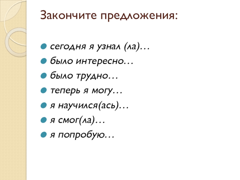 Закончите предложения: сегодня я узнал (ла)…было интересно…было трудно…теперь я могу…я научился(ась)…я смог(ла)…я попробую…