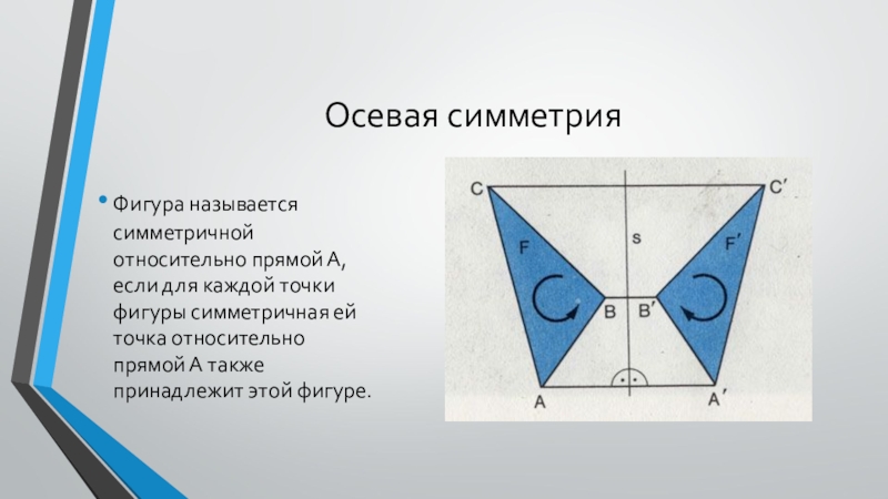 Осевая симметрияФигура называется симметричной относительно прямой А, если для каждой точки фигуры симметричная ей точка относительно прямой