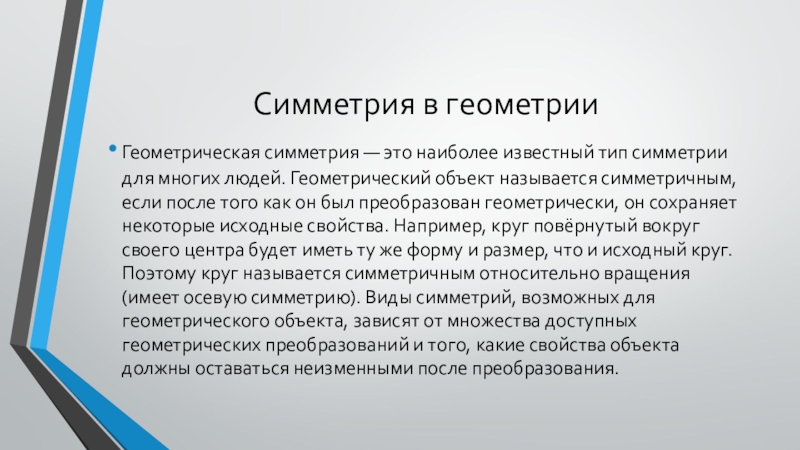 Симметрия в геометрииГеометрическая симметрия — это наиболее известный тип симметрии для многих людей. Геометрический объект называется симметричным,