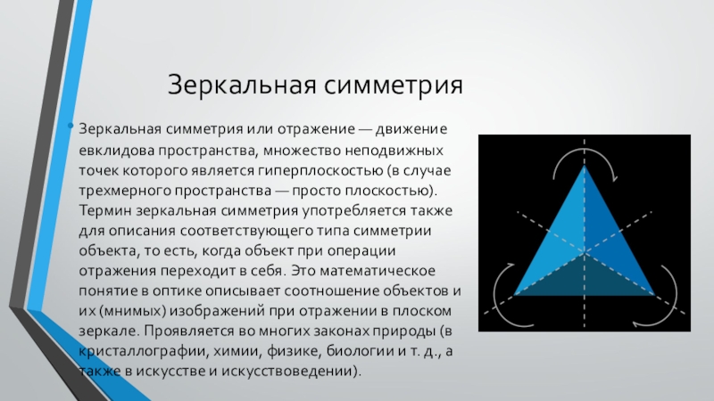 точек которого является гиперплоскостью (в случае трехмерного пространства — просто плоскостью). Термин зеркальная симметрия употребляется также для описания соответствующего типа симметрии объекта, то есть, когда объект при операции отражения переходит в себя. Это математическое понятие в оптике описывает соотношение объектов и их (мнимых) изображений при отражении в плоском зеркале. Проявляется во многих законах природы (в кристаллографии, химии, физике, биологии и т. д., а также в искусстве и искусствоведении).