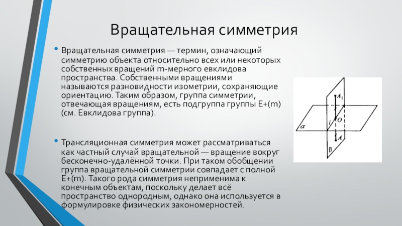 Вращательная симметрияВращательная симметрия — термин, означающий симметрию объекта относительно всех или некоторых собственных вращений m-мерного евклидова пространства.