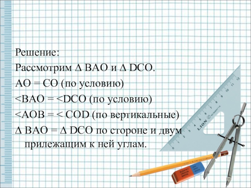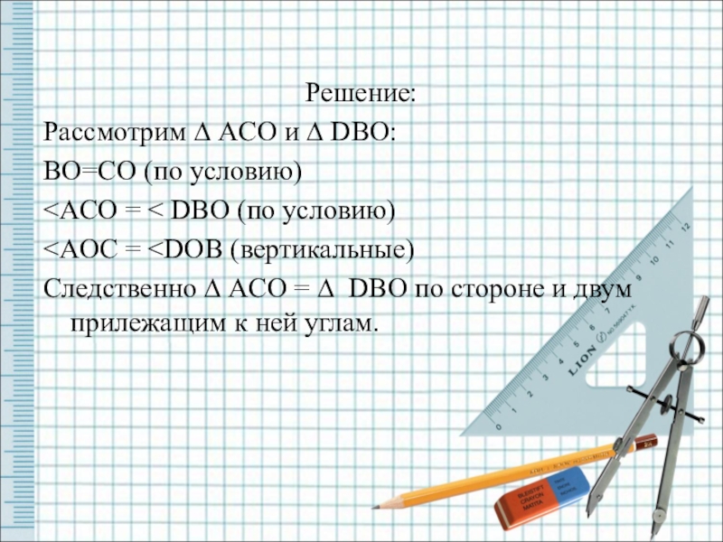 Следственно ∆ ACO = ∆ DBO по стороне и двум прилежащим к ней углам.