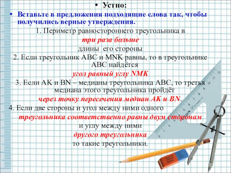Устно: Вставьте в предложения подходящие слова так, чтобы получились верные утверждения.1. Периметр равностороннего треугольника в три раза