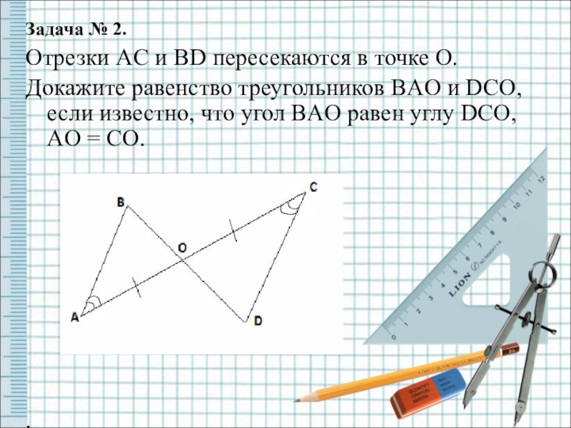Задача № 2.Отрезки AC и BD пересекаются в точке O.Докажите равенство треугольников BAO и DCO, если известно,