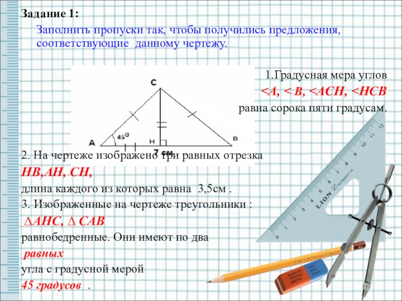 Задание 1:   Заполнить пропуски так, чтобы получились предложения, соответствующие данному чертежу.1.Градусная мера углов