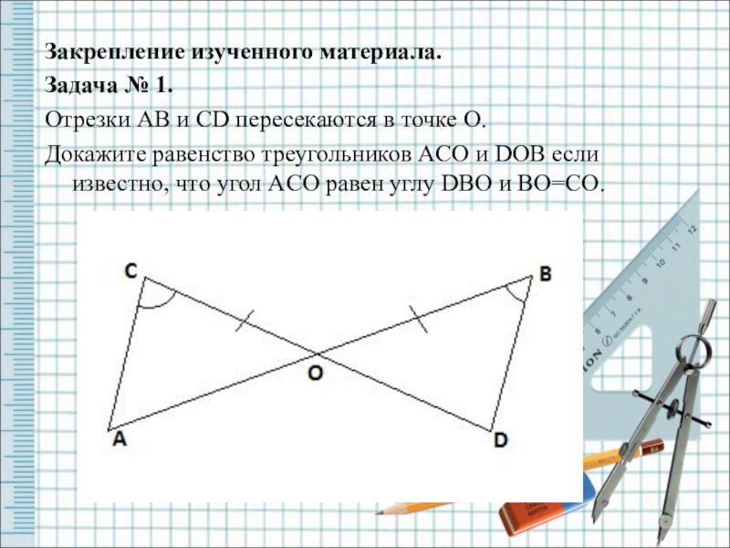 Закрепление изученного материала.Задача № 1.Отрезки AB и CD пересекаются в точке O.Докажите равенство треугольников ACO и DOB