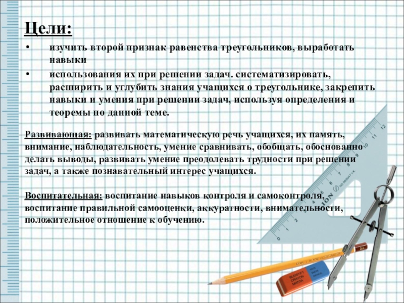 Цели: изучить второй признак равенства треугольников, выработать навыки использования их при решении задач. систематизировать, расширить и углубить знания учащихся о треугольнике, закрепить навыки и умения при решении задач, используя определения и теоремы по данной теме.Развивающая: развивать