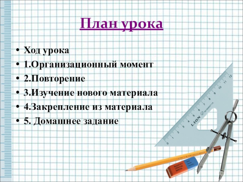 План урока Ход урока1.Организационный момент2.Повторение3.Изучение нового материала4.Закрепление из материала5. Домашнее задание