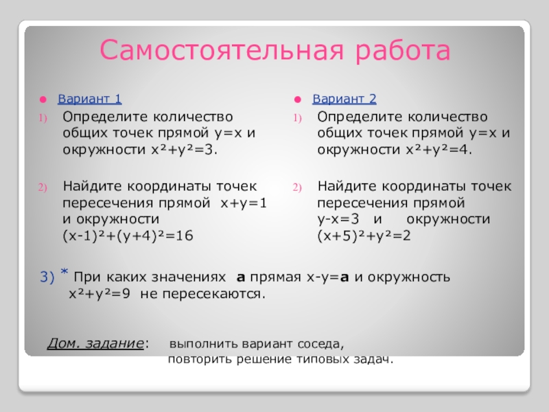 Определите количество общих точек прямой у=х и окружности х²+у²=4.
