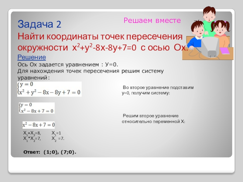 Найти координаты точек пересечения окружности х2+у2-8х-8у+7=0 с осью Ох.