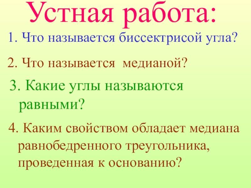 4. Каким свойством обладает медиана равнобедренного треугольника, проведенная к основанию?