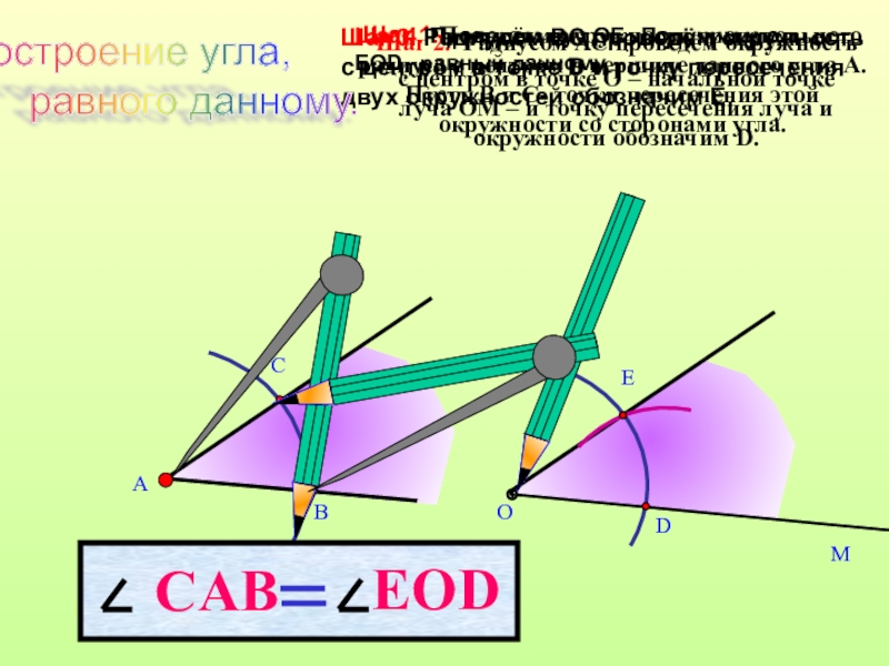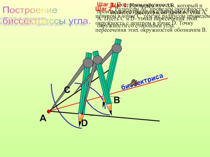 Шаг 1. Построим окружность произвольного радиуса с центром в точке А. Пусть С и D- точки пересечения этой окружности со сторонами угла.