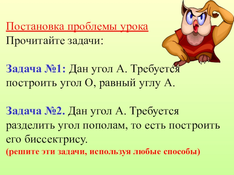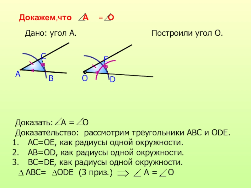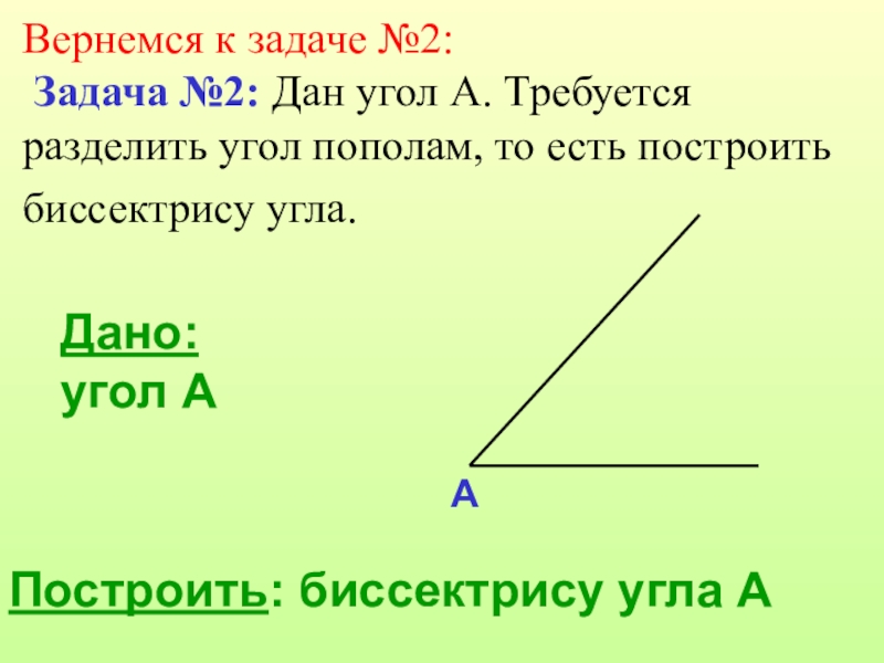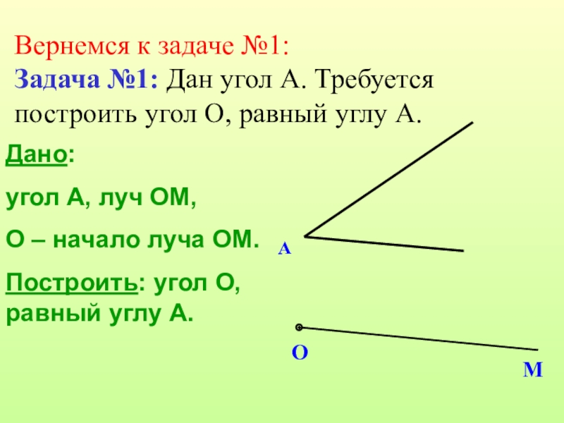 Задача №1: Дан угол А. Требуется построить угол О, равный углу А.