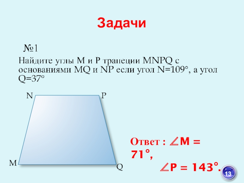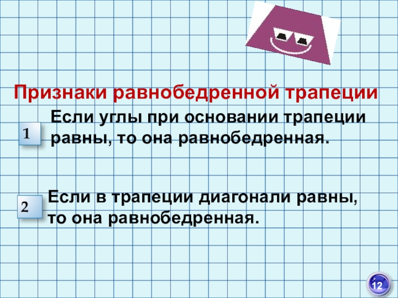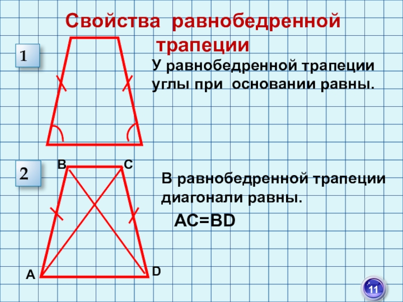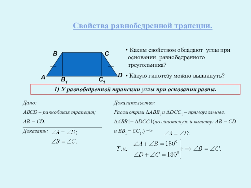 1) У равнобедренной трапеции углы при основании равны.