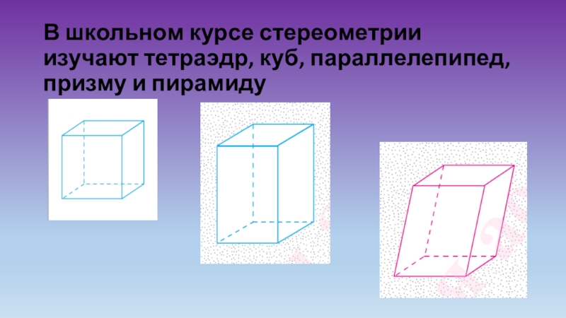 Слайд 4В школьном курсе стереометрии изучают тетраэдр, куб, параллелепипед, призму и пирамиду