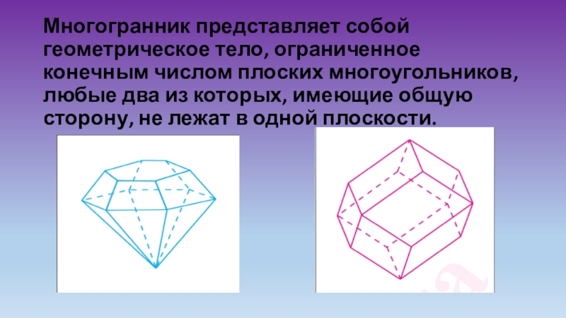 Слайд 3Многогранник представляет собой геометрическое тело, ограниченное конечным числом плоских многоугольников, любые