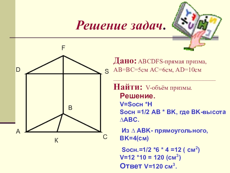 Решение. V=Sосн *H Sосн =1/2 AB * BK, где BK-высота ∆ABC.