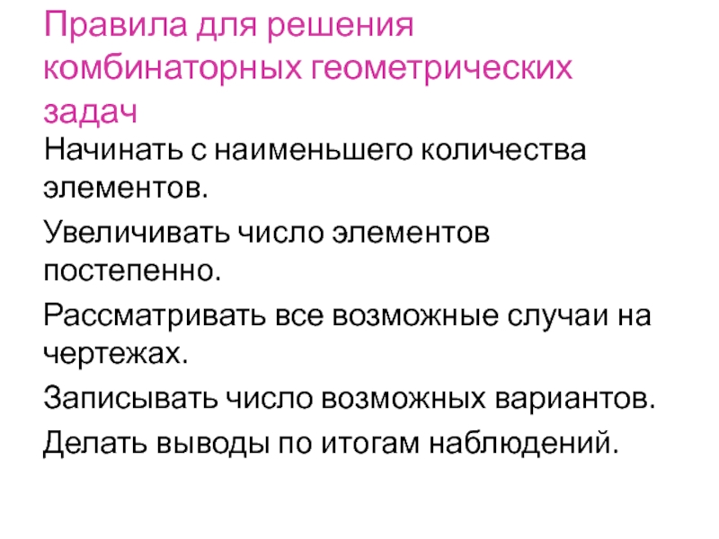 Правила для решения комбинаторных геометрических задачНачинать с наименьшего количества элементов.Увеличивать число элементов постепенно.Рассматривать все возможные случаи на