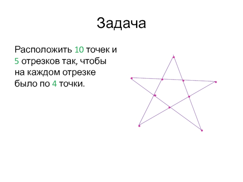 ЗадачаРасположить 10 точек и 5 отрезков так, чтобы на каждом отрезке было по 4 точки.