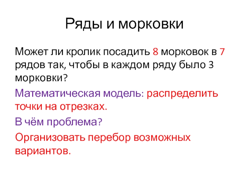 Ряды и морковкиМожет ли кролик посадить 8 морковок в 7 рядов так, чтобы в каждом ряду было 3 морковки?Математическая модель: распределить точки на отрезках.В чём проблема?Организовать перебор возможных вариантов.