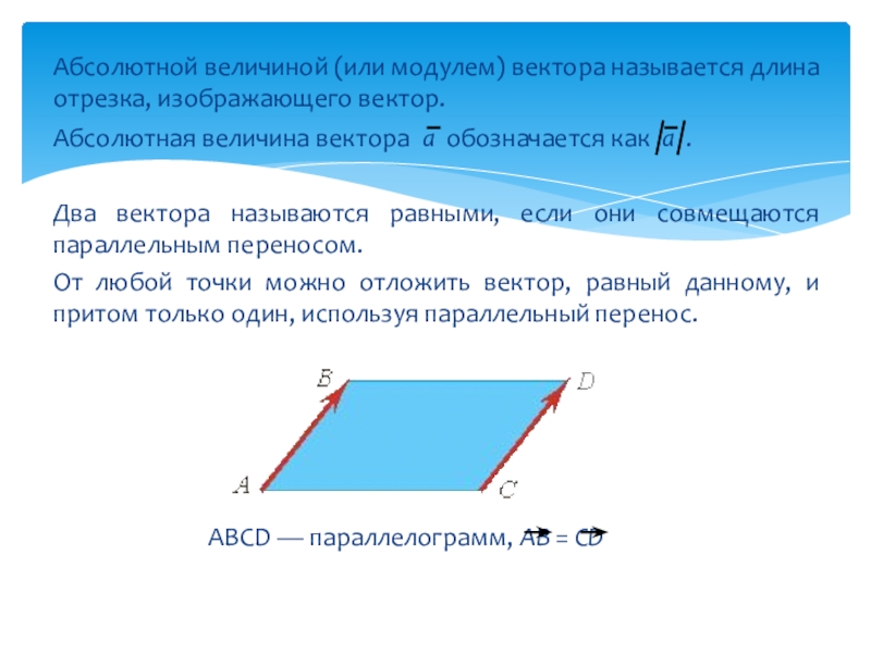 Абсолютной величиной (или модулем) вектора называется длина отрезка, изображающего вектор.Абсолютная величина вектора а обозначается как а .Два вектора называются равными, если они