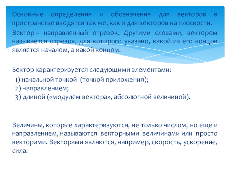 Величины, которые характеризуются, не только числом, но еще и направлением, называются векторными величинами или просто векторами. Векторами являются, например, скорость, ускорение, сила.
