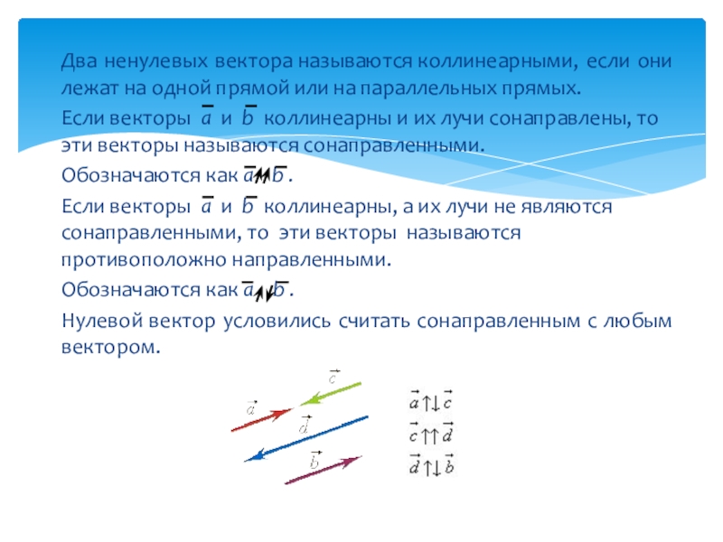 Слайд 7Два ненулевых вектора называются коллинеарными, если они лежат на одной прямой или на