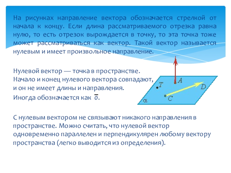 длина рассматриваемого отрезка равна нулю, то есть отрезок вырождается в точку, то эта точка тоже может рассматриваться как вектор. Такой вектор называется нулевым и имеет произвольное направление.
