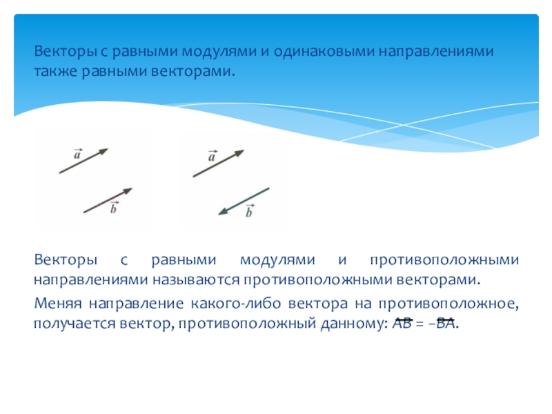 Векторы с равными модулями и одинаковыми направлениями также равными векторами. Векторы с равными модулями и противоположными направлениями называются противоположными
