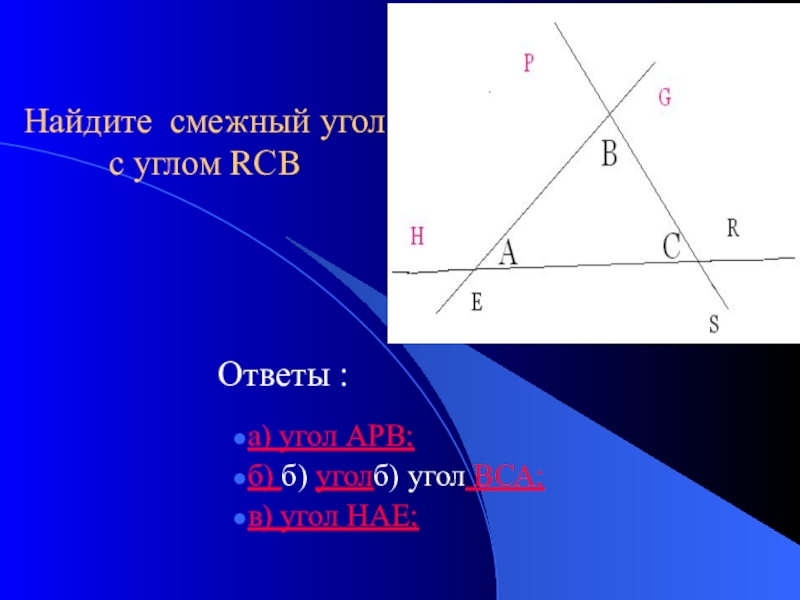 а) угол АРВ;б) б) уголб) угол ВСА; в) угол НАЕ;   Найдите смежный угол с углом
