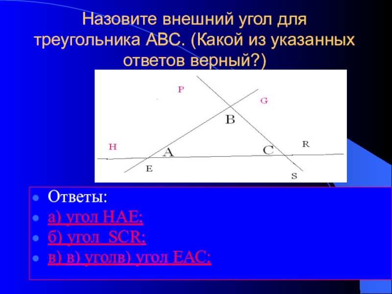 Слайд 7Назовите внешний угол для треугольника АВС. (Какой из указанных ответов верный?)