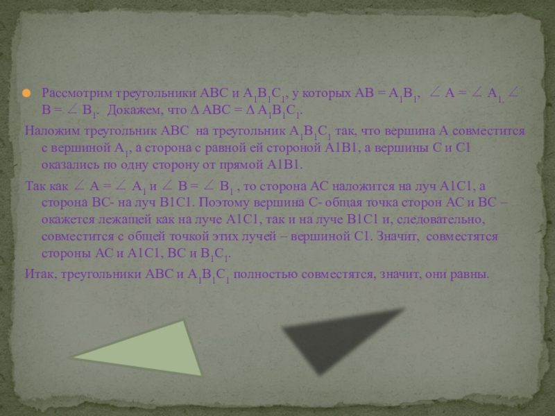 Если сторона и два прилежащих к ней угла одного треугольника соответственно равны стороне и двум прилежащим к ней углам другого треугольника, то такие треугольники равны.