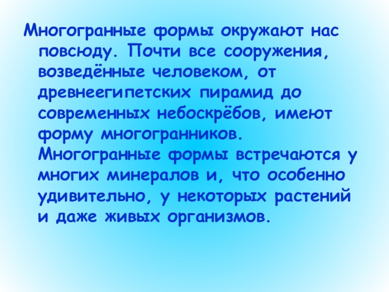 древнеегипетских пирамид до современных небоскрёбов, имеют форму многогранников. Многогранные формы встречаются у многих минералов и, что особенно удивительно, у некоторых растений и даже живых организмов.